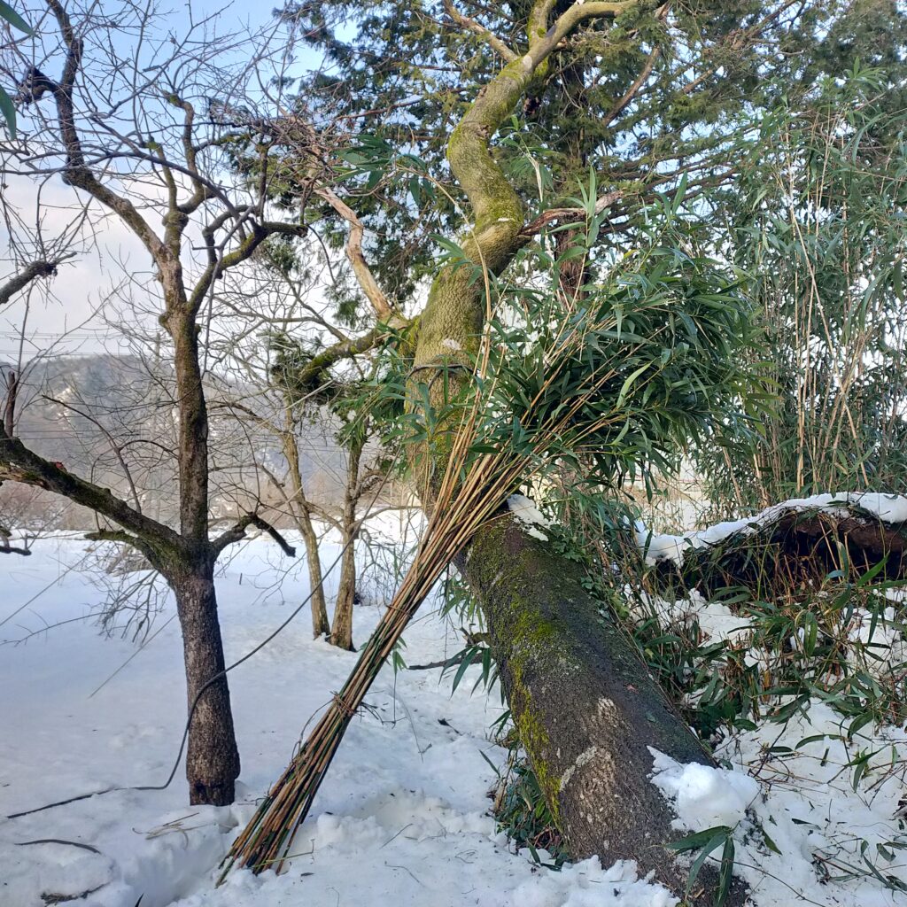 桐の木の根元が腐り倒れてヒノキと栗の木に寄りかかっている。