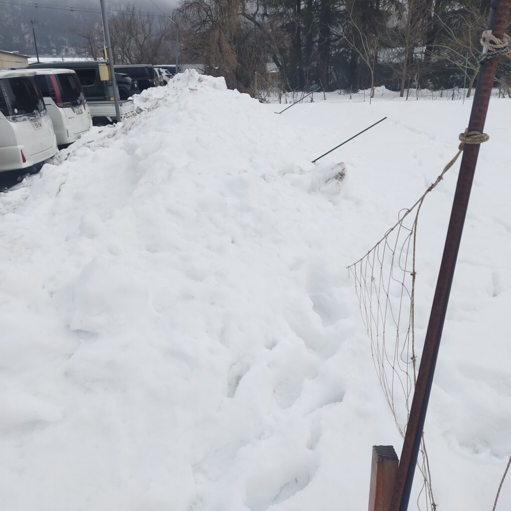 何本か 支柱を立てて垂れ下がったネットをあげる作業に入ろうと思ったが、駐車場の雪が畑側に寄せられて、修復不可能になっている。